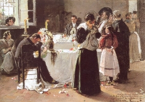 En Solo en el mundo de Jozef Israel (1824-1911) la situación es diferente, hay abatimiento no hay llanto, se asume una situación que no está exenta de dolor ni de tristeza. El autor nos da la clave al anunciarnos que el marido se va a quedar solo. Lo que no sabemos es si predomina la resignación o la desesperanza. En todo caso no parece una muerte dolorosa, es más bien plácida, al contrario que la serie de Hodler en sus últimos cuadros. Es el inicio del duelo.